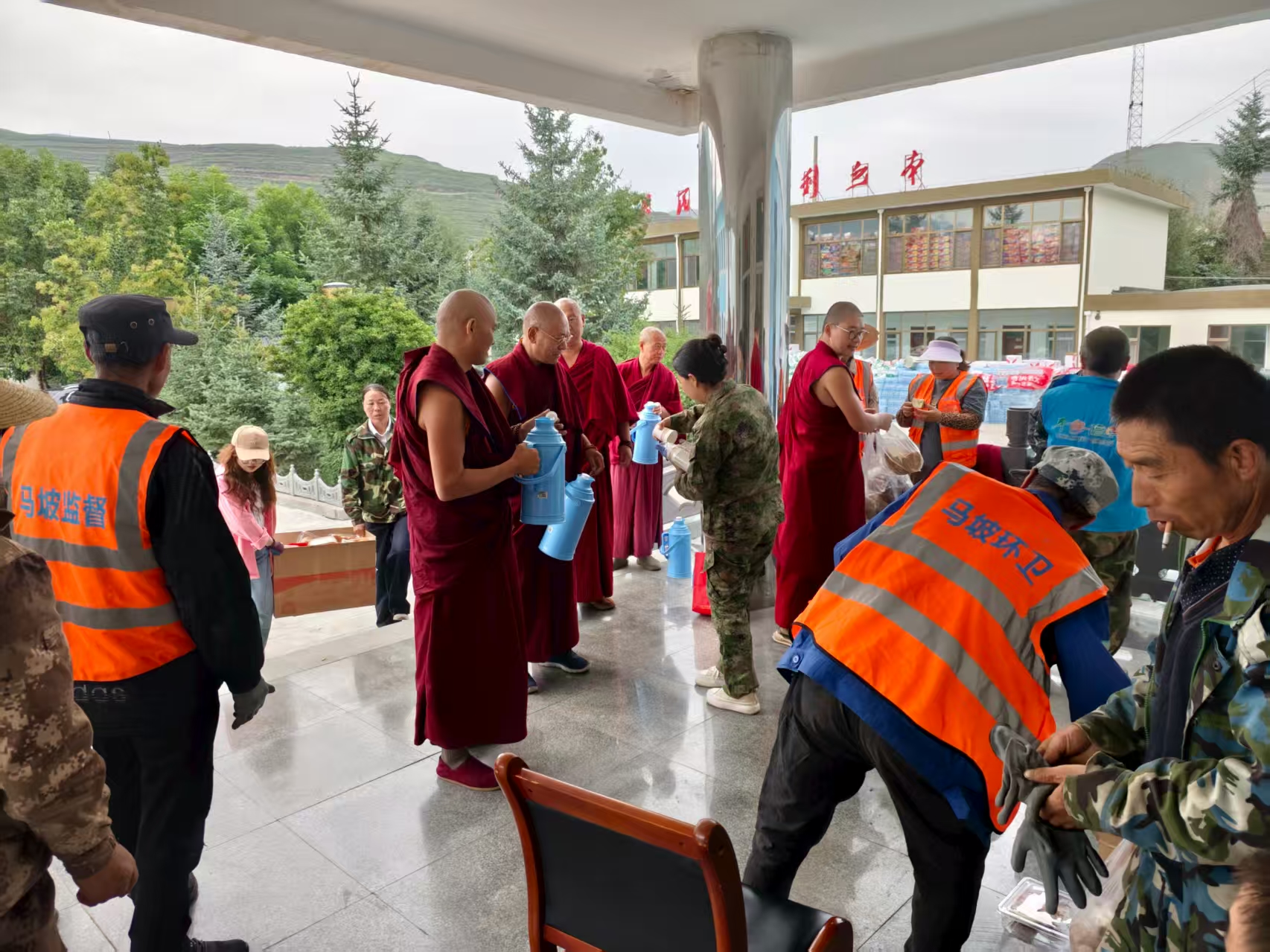 整齐码放的物资堆前,桶装方便面、面包、油锅盔一眼望不到头,每一件都贴着寺院的祈福标签。这些物资,是僧人们从有限的寺产中挤出的心意,更是西北藏族同胞对受灾乡亲的牵挂。活动尾声,马坡乡政府工作人员与师父们并肩合影,镜头里,长袍与制服相映,笑容与真情相融,定格下携手抗灾的温暖瞬间。