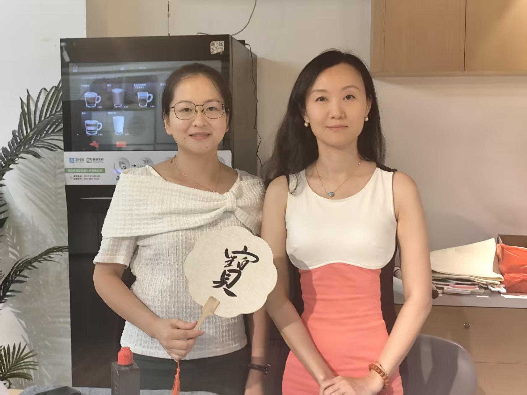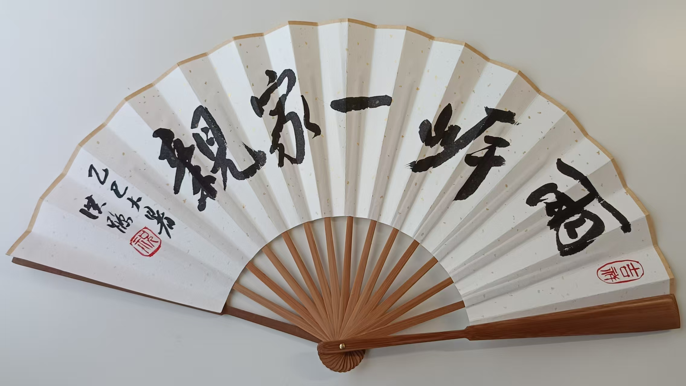 书法交流环节成为活动的亮点。洪鹃深入介绍了书法与节气文化的渊源,让大家领略到书法艺术中蕴含的节气韵味和意境。随后,洪鹃现场挥毫泼墨,在扇子上写下到场嘉宾姓氏,笔锋游走间,将大暑的热烈与生机展现得淋漓尽致。接着,她书写了“两岸一家亲”纸扇书法作品,将深厚的情谊融入笔墨之间。她向大家阐释了这幅作品所承载的意义,强调两岸文化同根同源,希望以书法为纽带,增进两岸同胞的情感交流。书写完成后,洪鹃与茶友们积极互动交流,耐心解答大家关于书法学习的疑问。现场气氛热烈而融洽,大家沉浸在书法的世界里,感受着传统文化的魅力。