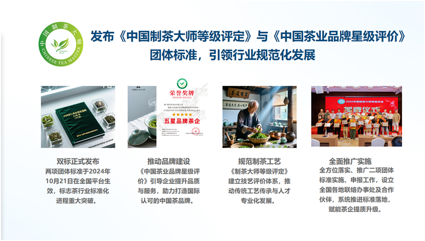《中国茶行业品牌建设星级评价指南》和《中国制茶大师等级评定指南》两项团体标准于2023年6月6日立项,2024年10月21日发布生效,这标志着中国茶行业在品牌建设和制茶工艺方面取得了重大进步。目前,正全方位落实、推广两项团体标准的实施与申报工作,并设立全国各地联络办事处及合作伙伴,以推动行业规范化发展。