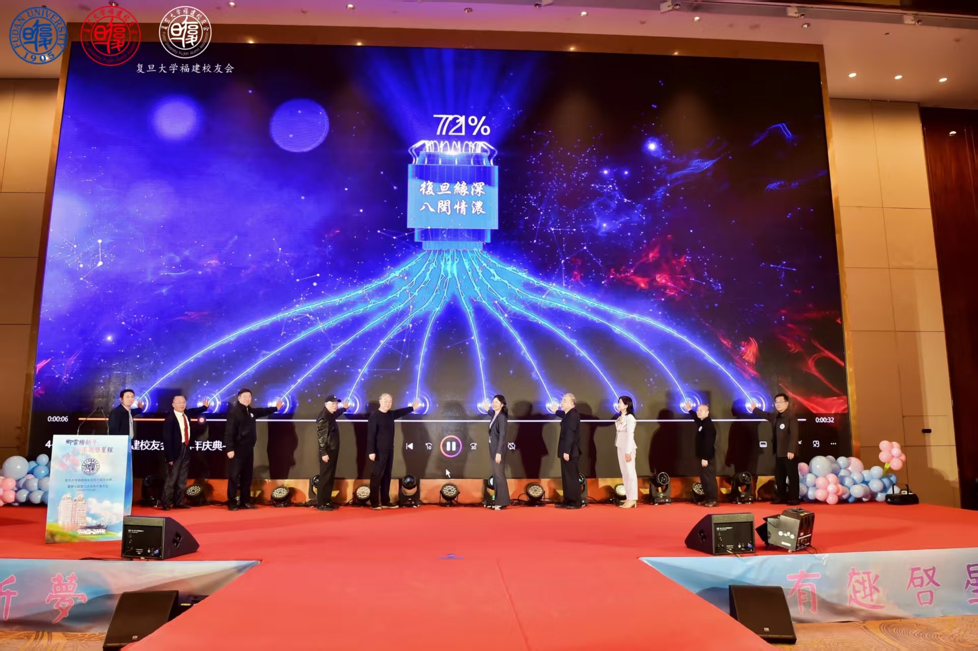 福建复旦校友会自1985年扬帆起航,2000年与上海医科大学福建校友会携手合建,如今已稳步迈入第七届征程,在闽校友数量超过6000人,成为推动福建发展的中坚力量。第七届理事会会长章英芬积极整合各方资源、强化联络沟通,带领理事会精心组织多项活动,让校友会真正成为校友们温馨的家园。在热烈的掌声中,复旦大学常务副校长、校友总会副会长、秘书长许征,复旦大学校友总会顾问、东华大学原校长、复旦大学原副校长徐明稚,福建省外大学校友会联合会会长周元勋,名誉会长吕祥松,复旦大学福建校友会会长章英芬、高级顾问戴金珊、周榕、叶子、黄加庆,副会长宋建平等一同上台,共同启动福建复旦大学校友会四十周年庆典,标志着这场盛会正式拉开帷幕。