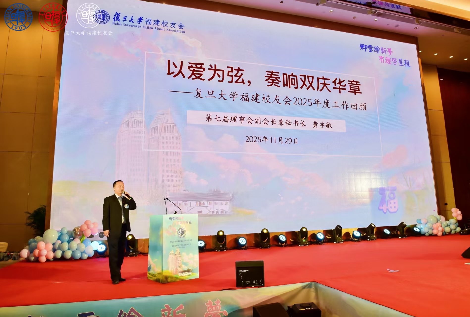 福建校友会资深顾问周榕校友作为40年发展历程的见证者登上发言台。他深情地分享道,福建校友会就像一棵参天大树,将数千名校友紧紧凝聚在一起,搭建起一个资源对接的优质平台。在这里,校友们能够获得职场上的帮扶、找到志同道合的伙伴、重拾校园里的情谊。他的发言情真意切,赢得了阵阵掌声。校友们还一同观看了复旦大学福建校友会四十周年专题视频,这段由多位校友精心制作的视频,记录了校友会从初创时的艰难起步到逐渐壮大的关键瞬间,收录了众多校友的祝福与期盼。它是四十年光阴的生动缩影,让大家真切感受到了那份跨越时空的创会初心、传承温度与赤子之心。
